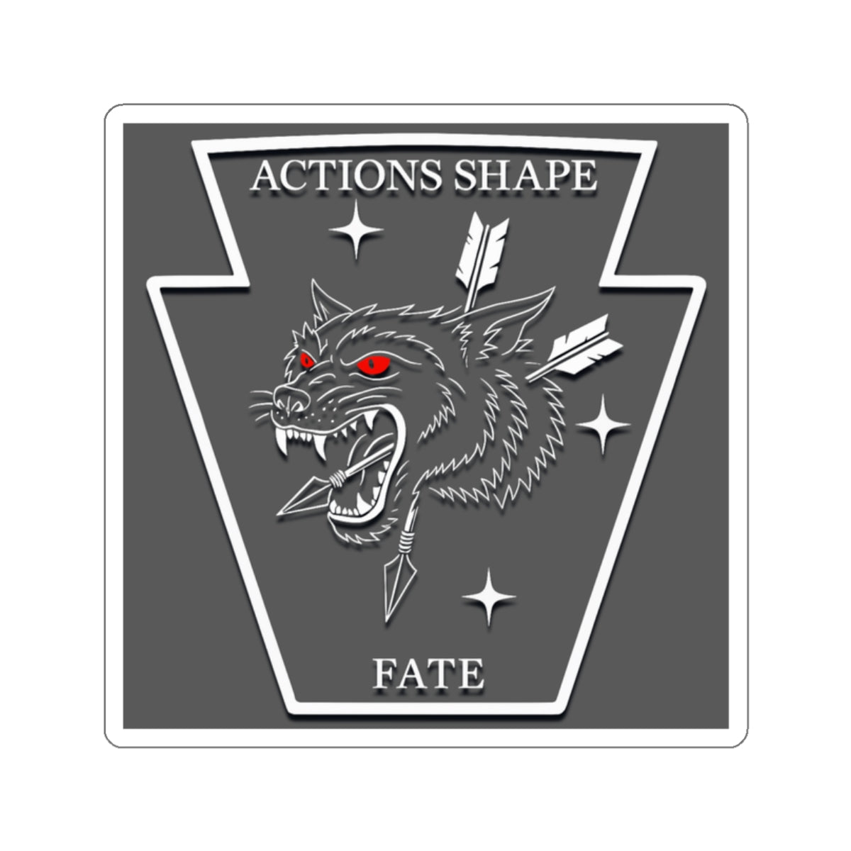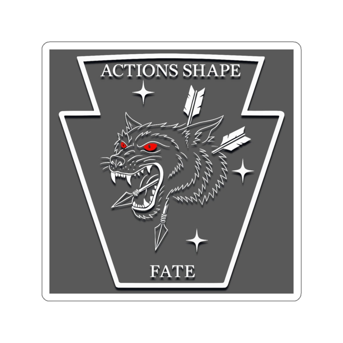 A bold die-cut sticker that channels grim determination and gritty charm. A snarling wolf head, punctured by arrows and set inside a keystone-shaped frame, stares out with glowing red eyes. Stark monochrome tones and a matte finish give this sticker a subdued, tactical look that reads like a secret patch or mission emblem. Weatherproof vinyl and a UV protective laminate mean the graphic stays sharp on water bottles, laptops, toolboxes, or outdoor gear. Place it where grit and attitude belong — on the back of a sketchbook, the corner of a laptop, or the bumper of a truck — and let it read as a small declaration: actions shape fate.