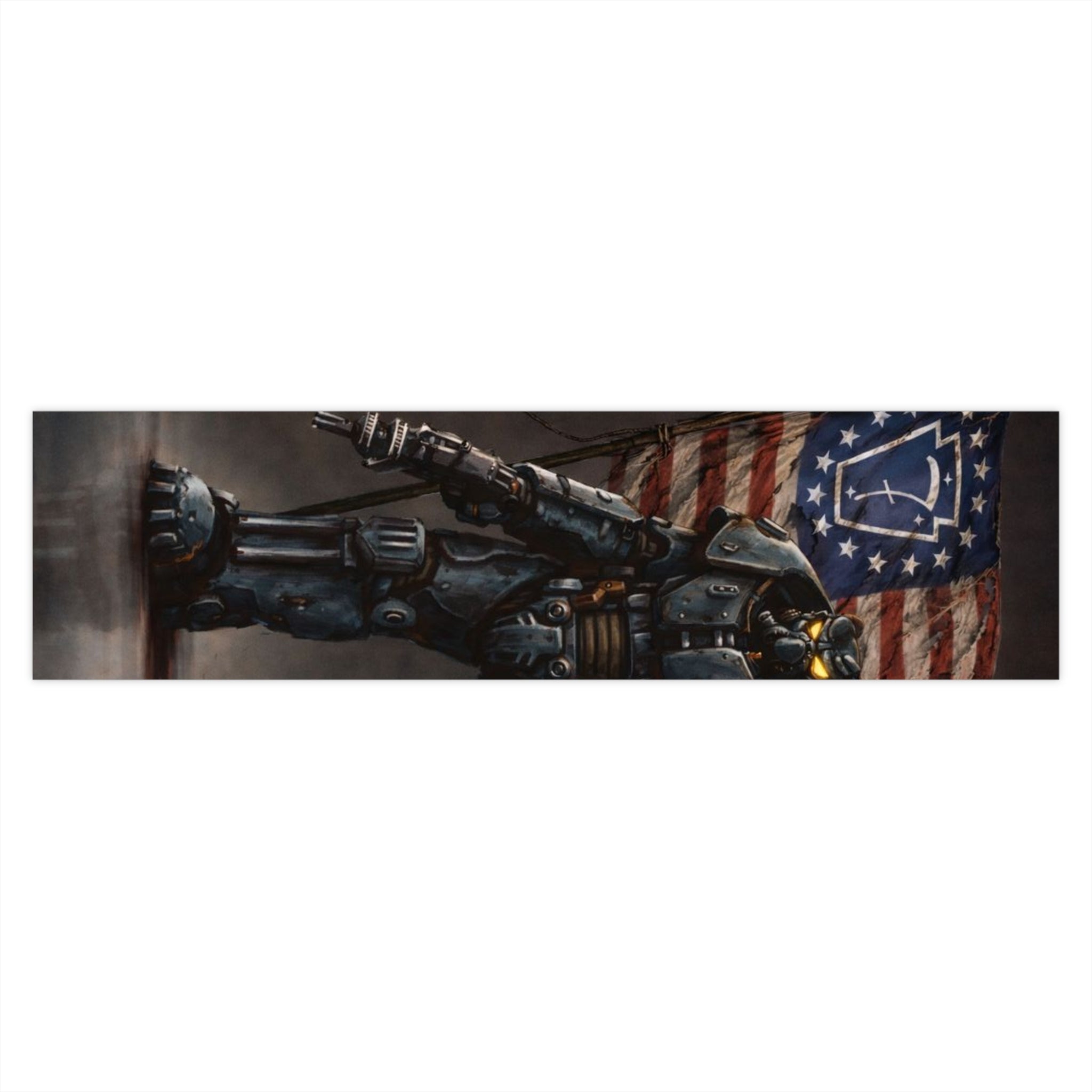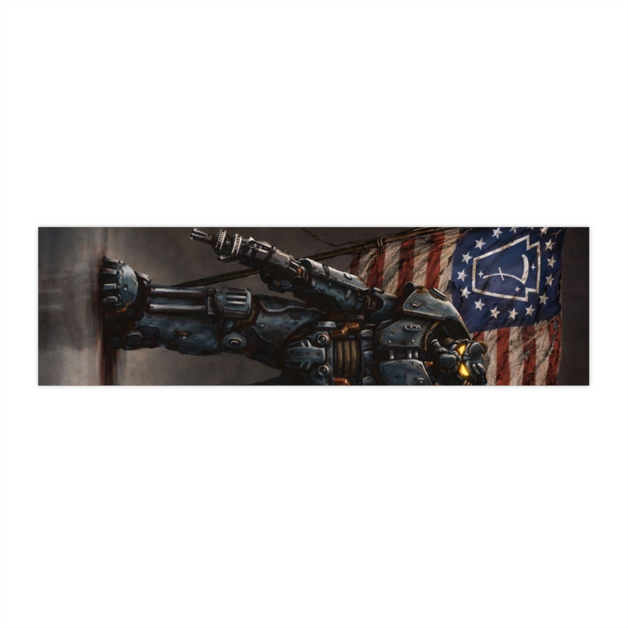 A bold, weather-ready bumper sticker that carries a gritty, patriotic sci-fi vibe. The matte-finish vinyl showcases crisp, vibrant colors and a detailed illustration of a battle-armored figure standing before a distressed American flag — a piece that reads like a mini poster for vintage futuristic pulp. Built to handle rain, sun, and city streets, the sticker keeps its tones true with UV-protective laminate and eco-friendly inks. Stick it on a truck, toolbox, laptop, or surfboard to add a rugged, narrative-driven accent to your gear.